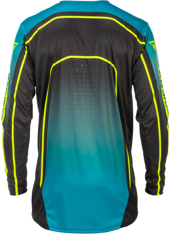 The Fly Racing Youth Rayce Bicycle Jersey in Teal, Black, and Lime is designed for young riders seeking comfort and performance on the trail or track. Crafted from a durable, long-sleeve four-way stretch jersey, this jersey provides excellent mobility and flexibility, allowing young cyclists to move freely during intense rides. The multi-panel construction ensures a snug yet comfortable fit, reducing distractions and enhancing overall riding experience. Mesh ventilation panels are strategically placed on the sides and underarms to dissipate unwanted heat, keeping riders cool and comfortable during demanding activities.