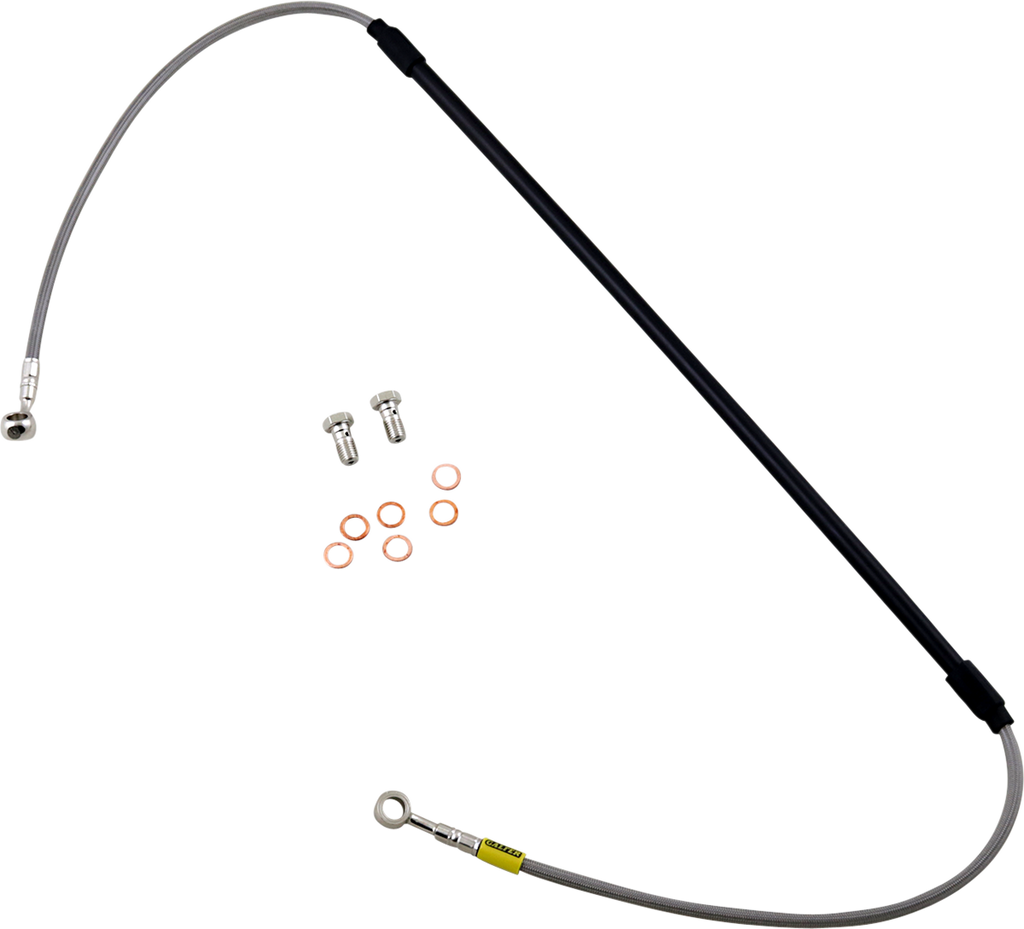 64 braided strands of steel around the line, making the line have zero expansion at any time - better than any other braided line, Requires less pressure at the lever, allowing the rider to use less force while stopping the bike faster and with better feel, Fittings come from the factory pre-positioned but can swivel 180° if necessary to make the installation process easier, Include a clear outer coating which protects the bike from scratches and the lines from humidity, Complete with all necessary banjo bolts and washers, Ready to install