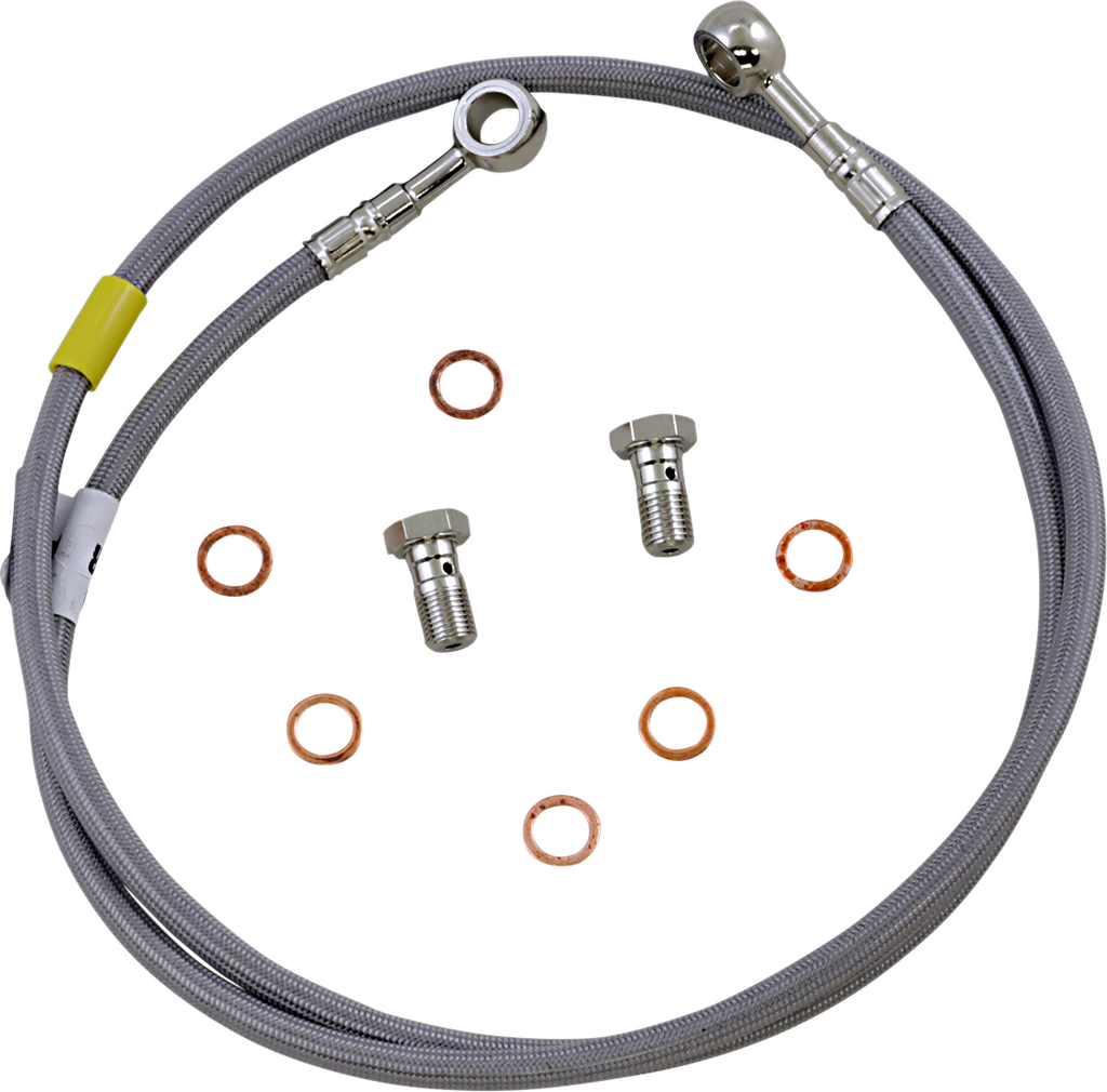 Stainless Steel lines are typically the first upgrade you should make, Stock rubber lines will break down and expand, causing a spongy feel or worse. Steel lines eliminate expansion which results in consistent feel and performance, Made with only DuPont virgin grade PTFE (Polytetrafluoroethylene) inner core, 64 strand braid, Includes all mounting components, extra washers, and line end labeling, and bike specific installations, R&D and manufacturing done in the US