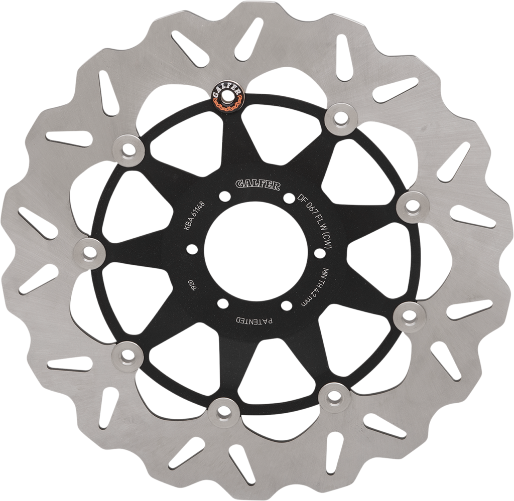 Laser-cut double disc ground 420 high carbon stainless steel, Direct-replacement brake rotors; do not require any extra parts, bolt on just like a stock brake disc, Full-floating design rotors have an aluminum center carrier, Improves brake lever feel and modulation, Rotors cool as they rotate to lower brake operating temperatures, Design is self-cleaning, removes water as it rotates, Less tendency to warp, Manufactured in Spain, For maximum braking performance and rotor longevity, Galfer recommends using Galfer brake pads with Galfer rotors.