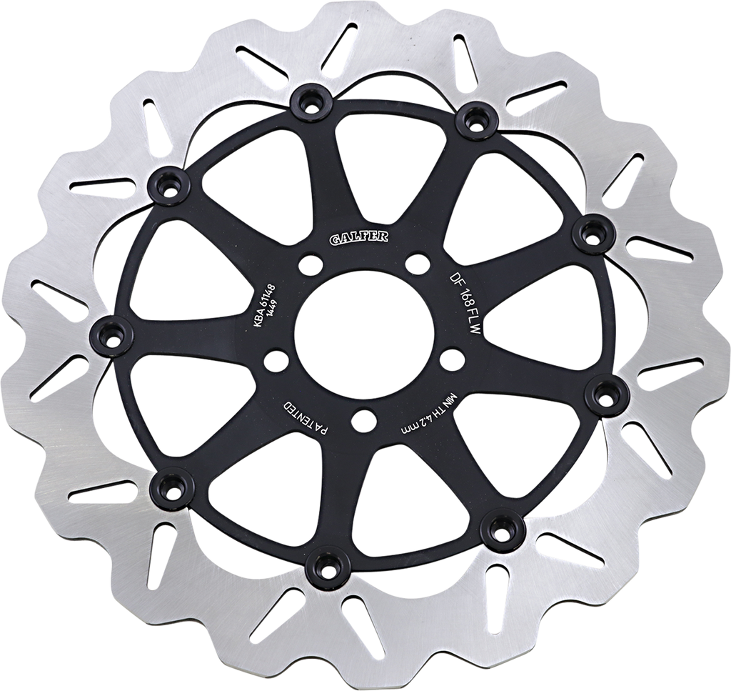Laser-cut double disc ground 420 high carbon stainless steel, Direct-replacement brake rotors; do not require any extra parts, bolt on just like a stock brake disc, Full-floating design rotors have an aluminum center carrier, Improves brake lever feel and modulation, Rotors cool as they rotate to lower brake operating temperatures, Design is self-cleaning, removes water as it rotates, Less tendency to warp, Manufactured in Spain, For maximum braking performance and rotor longevity, Galfer recommends using Galfer brake pads with Galfer rotors.
