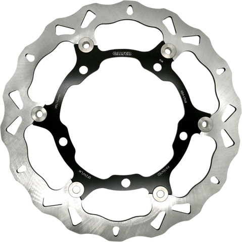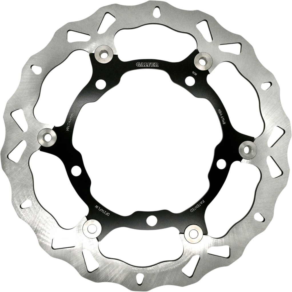 Laser-cut double disc ground 420 high carbon stainless steel, Direct-replacement brake rotors; do not require any extra parts, bolt on just like a stock brake disc, Full-floating design rotors have an aluminum center carrier, Improves brake lever feel and modulation, Rotors cool as they rotate to lower brake operating temperatures, Design is self-cleaning, removes water as it rotates, Less tendency to warp, Manufactured in Spain, For maximum braking performance and rotor longevity, Galfer recommends using Galfer brake pads with Galfer rotors.