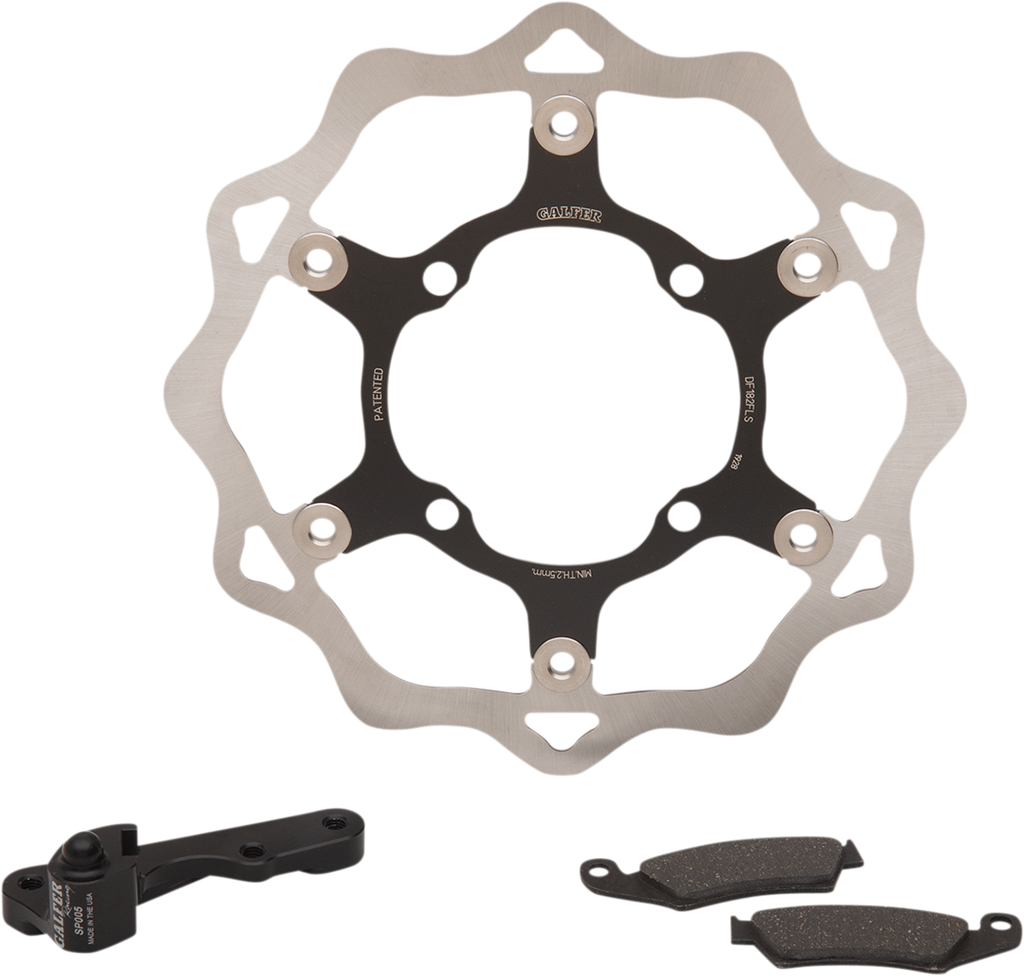 270mm full-floating brake rotor, Kit includes 6061-T6 aluminum relocating bracket and semi-metallic brake pads, Designed for track, trail, and everyday use, Best friction surface of any stainless steel brake rotor, Full-floating Wave® blades ensure optimum pad-to-rotor contact for maximum stopping force and feel, Seamlessly replaces stock brake rotor, Extremely predictable and consistent, Provides outstanding performance even in the most aggressive conditions, Drastically increases lever feel, modulation and brake torque