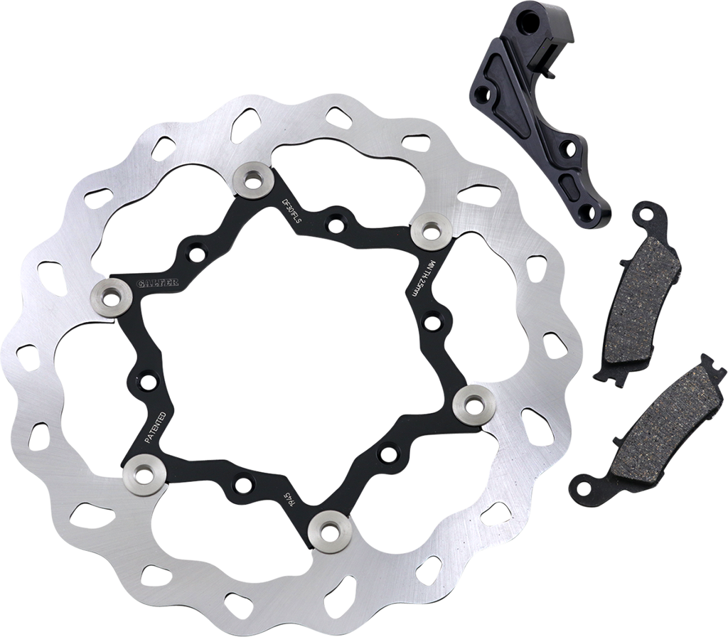 270mm full-floating brake rotor, Kit includes 6061-T6 aluminum relocating bracket and semi-metallic brake pads, Designed for track, trail, and everyday use, Best friction surface of any stainless steel brake rotor, Full-floating Wave® blades ensure optimum pad-to-rotor contact for maximum stopping force and feel, Seamlessly replaces stock brake rotor, Extremely predictable and consistent, Provides outstanding performance even in the most aggressive conditions, Drastically increases lever feel, modulation and brake torque