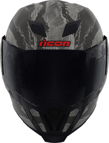 Injection molded polycarbonate shell for strength, Multiple oversized intake and exhaust ports, Fog-Free Dropshield* with exterior switch, Quick-change Fog-Free Fliteshield* with side plates, Removable molded breath deflector and chin curtain, Recessed twin channel supervent cooling system, The Dropshield* visor must only be used while the main face shield is in the fully closed position, Internal speaker pockets work with ICON's R.A.U. Bluetooth device, Removable Hydradry* moisture wicking liner, Includes Clear Fliteshield* and Dark Smoke Forceshield*, Includes Dark Smoke Dropshield*