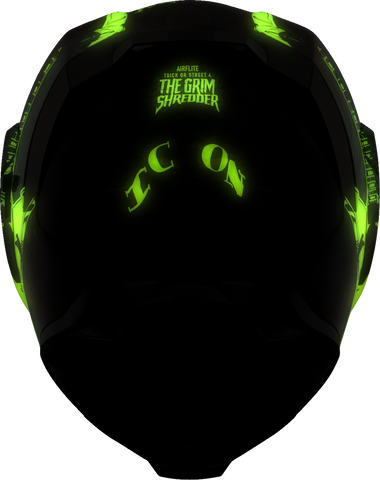 Injection molded polycarbonate shell for strength, Quick-change Fog-Free Fliteshield* with side plates, Fog-Free Dropshield* with exterior switch, Multiple oversized intake and exhaust ports, Removable Hydradry* moisture wicking liner, Removable molded breath deflector and chin curtain, The Dropshield* visor must only be used while the main face shield is in the fully closed position, Internal speaker pockets work with ICON's R.A.U. Bluetooth device, Recessed twin channel supervent cooling system