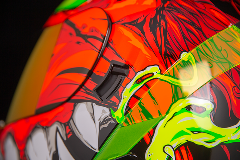 Injection molded polycarbonate shell for strength, Internal airflow geometry, Continuous venting system, Sculpted neck roll, Fog-free ICON Optics™ Shield with Rapid-Release™ System, Prolock™ positive shield locking system, Internal Dropshield™ with exterior switch, The Dropshield™ visor must only be used while the main face shield is in the fully closed position, Removable molded breath deflector, Removable Hydradry™ 3-piece moisture wicking liner, Internal speaker pockets work with ICON's R.A.U. Bluetooth device