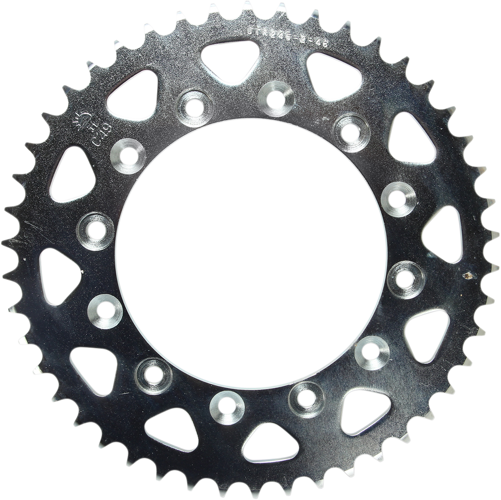 Computer designed to achieve ultimate strength at minimum weight, JT combines leading-edge technology with top materials to produce the ultimate quality sprocket range with unbeatable value, Every sprocket meets or exceeds the highest possible quality standards, Sprockets are heat-treated and beadblasted to reduce material surface tension, Front sprockets are made with top-quality Japanese C45 high carbon steel and SCM415 chromoly steel alloy, Steel rear sprockets are made with top-quality Japanese C45 high carbon steel, Aluminum rear sprockets are made with high strength Austrian 7075 T-6 anodized aluminum, JT aluminum sprockets are about 30% lighter than a comparable steel equivalent, which reduces un-sprung rotating weight and improves performance