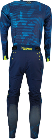 Light-weight durable stretch polyester woven chassis, Stretch ripstop polyester woven knee and seat, Stretch knee area for slim fit over knee braces or guards, Double-layer knee system with extended leather outer and inner knee guard, Laser cut vent holes, Sublimated graphics, Pre-bent ergonomic pant design, 3-point waist adjustment system, High quality YKK® zipper