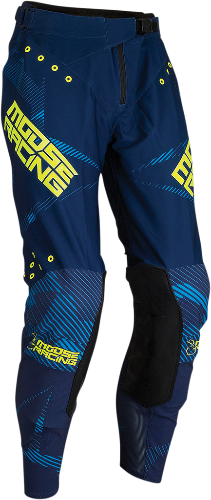 Light-weight durable stretch polyester woven chassis, Stretch ripstop polyester woven knee and seat, Stretch knee area for slim fit over knee braces or guards, Double-layer knee system with extended leather outer and inner knee guard, Laser cut vent holes, Sublimated graphics, Pre-bent ergonomic pant design, 3-point waist adjustment system, High quality YKK® zipper