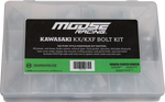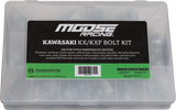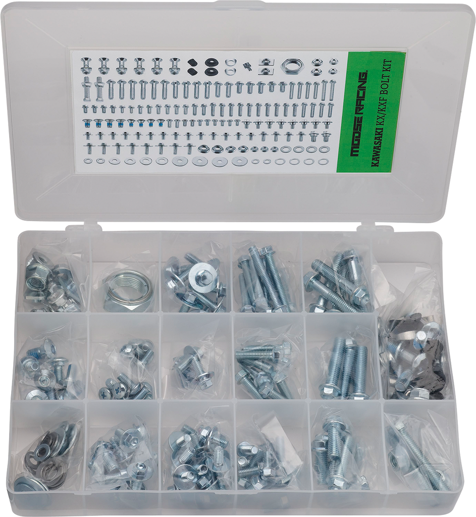 205 pieces include factory style hex flange bolts with captured washers, hex head flange bolts, shroud bolts, seat bolts, sub-frame bolts, fork guard bolts, rotor bolts, sprocket bolts, factory hardware, rim lock spacers, valve stem parts, chain guide parts, Fuji lock nuts, misc washers and an axle nut, Many parts will fit other Kawasaki dirt bikes