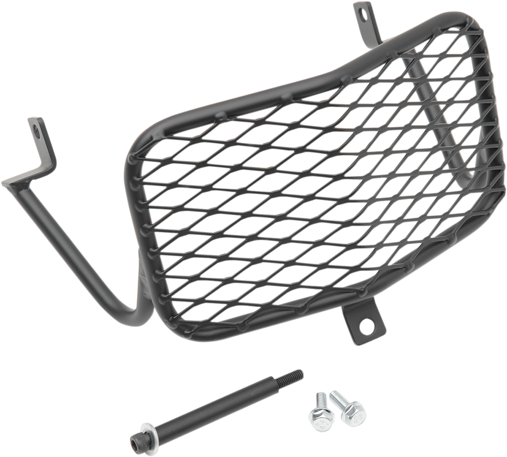 Fabricated from mild steel and expanded metal, This guard will protect the headlight from flying debris, Powder-coated flat black, Light weight with limited reduction in light output, Easy installation with all required hardware provided, Made in the U.S.A.