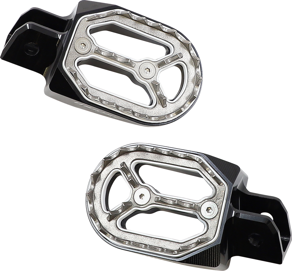 Two-piece light weight footpeg design, CNC machined aluminum alloy construction, Extra wide replaceable stainless steel footplate providing the rider with ultimate grip, The stainless steel footplate also sits inside a rubber damper helping to absorb shock, Use your OEM springs, Available in black only