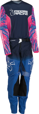 Youth Agroid Pants - Pink/Blue - 28 Non-fading sublimated graphics, High-denier abrasion-resistant polyester, Athletic-fit stretch panels, Pre-curved leg for ergonomic riding position, YKK® auto-locking zipper, Three-point waist adjustment system