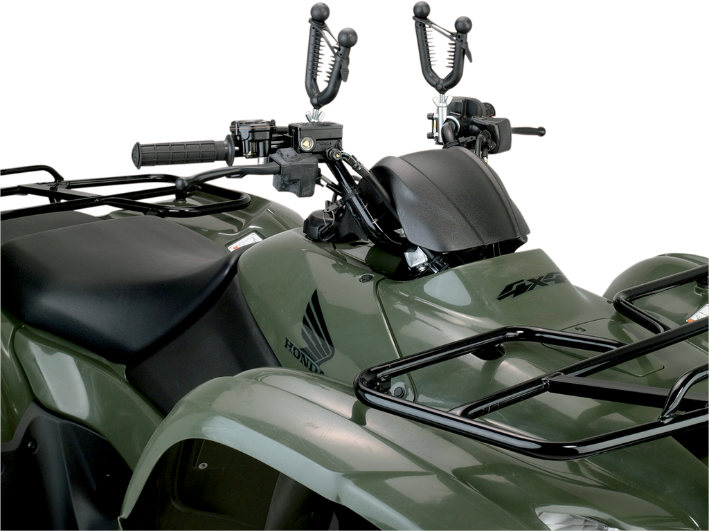 Soft rubber fins and extra rubber in the bottom to hold your gear securely, Uses alternating long and short rubber fins to cushion objects being carried, but doesn't bind up, making items easier to remove, Aluminum blocks attach to handlebars or ATV cargo rack rails, Twist the fork and lock the wingnut for tighter fit, Rubber snubbers included for use in rough terrain