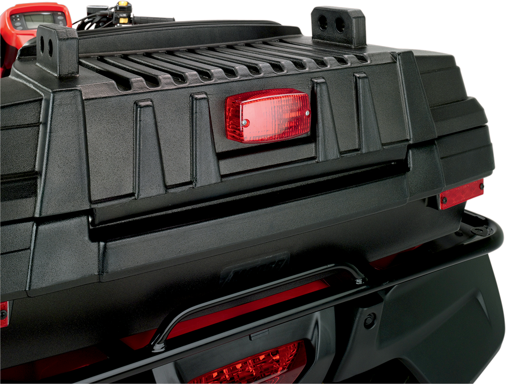 Made from easy-to-clean, high-impact-resistant polyethylene, Large access door for storage, UV-stabilized, Fits most ATVs; U-bolts for mounting, Measures 37-1/4" L x 22" W x 15-1/4" D, Key lock lid, Security reflectors on both sides, Integrated rear brake light