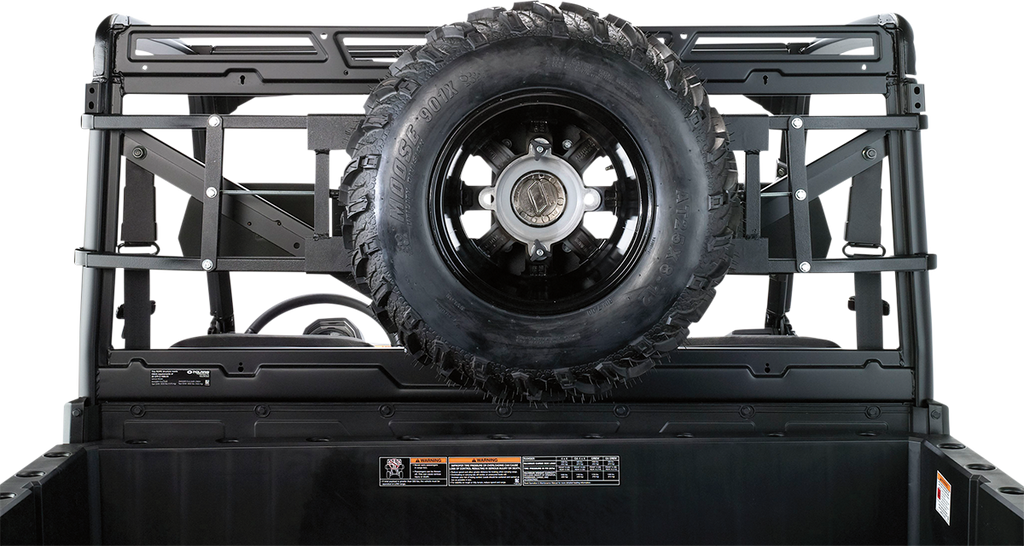 Works equally well attached to the frame of the UTV top or to the back of the cab, Installs in seconds with no drilling or bolting required, The spare tire is held in place with two mounting studs and secured with easy-grip, fluted wing-knobs, The unit fits UTVs with frames (roll bars) from 50-64" wide