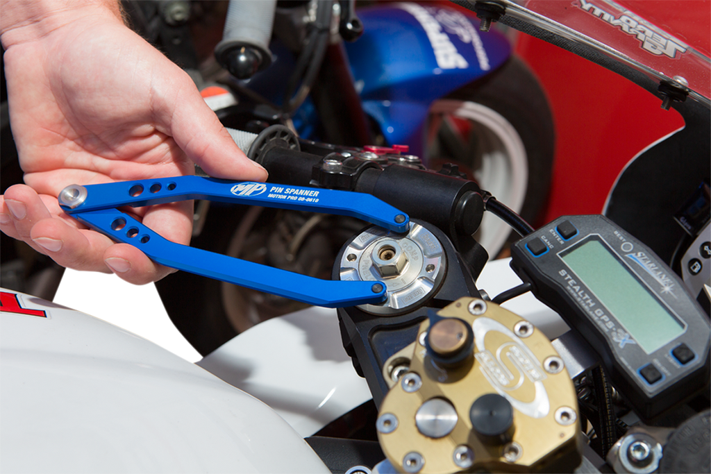 Low-profile pins provide added clearance on fork caps, Designed for use on many forks and shock absorbers, Replaceable hardened tool steel pins, Includes 4 mm and 3 mm pins