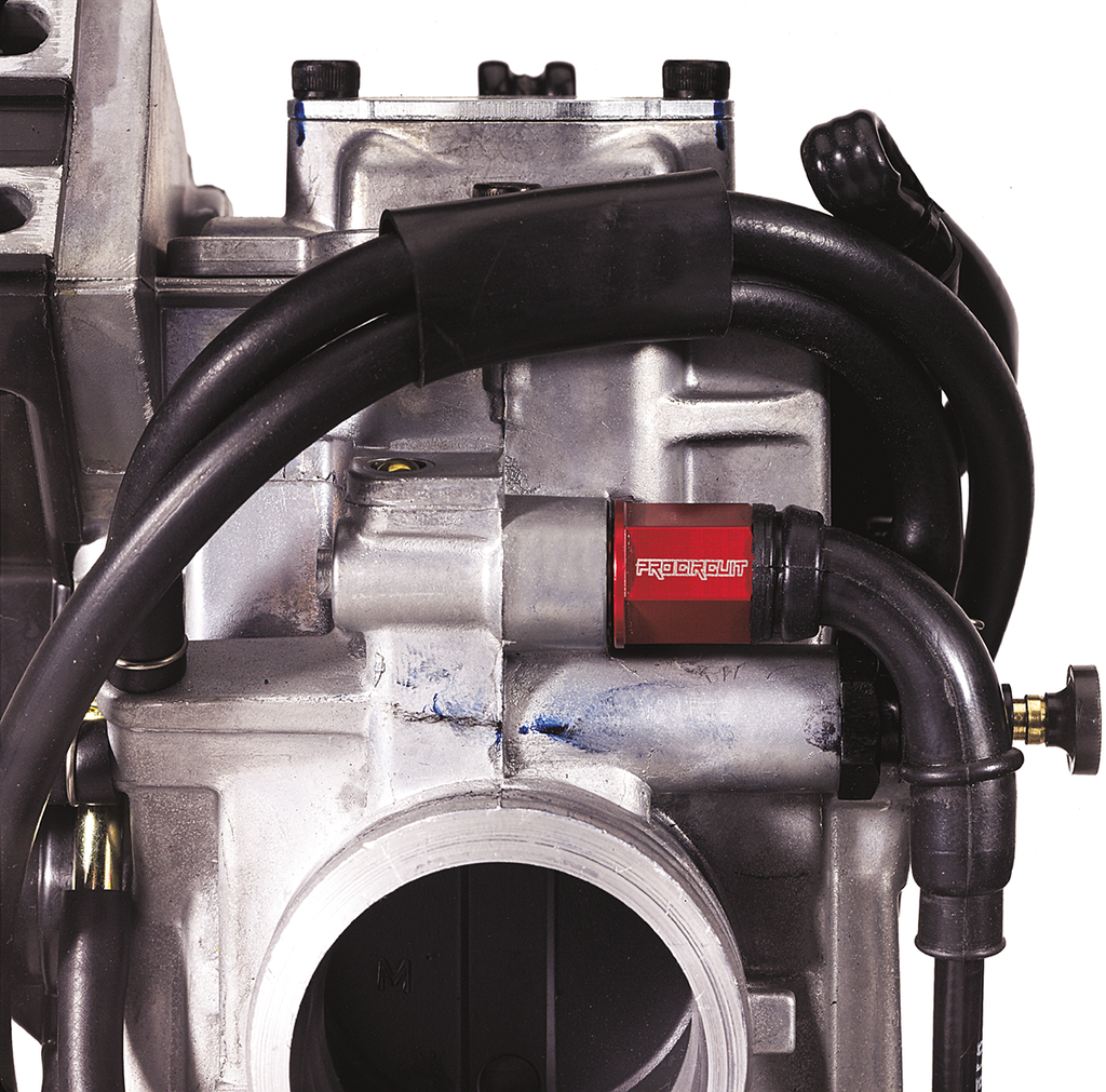 12mm hex design allows for easier tightening, and because it is made from aluminum, it seals better against the carb body than the stock plastic fitting, Eliminates the breakage and stripping problems associated with the OEM plastic units, Red anodized finish with the Pro Circuit logo etched on the side, Connects hot start cable to carb