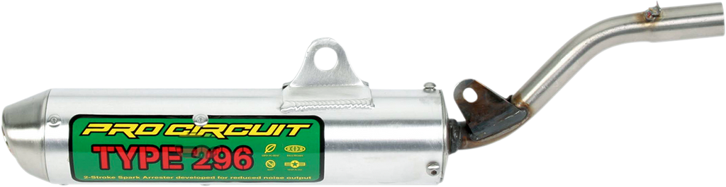 The Type 296 Silencer is a quiet spark arrestor that should be used when riding in noise sensitive areas or any National Forest, U.S. Forest Service approved and will reduce your bike's noise level at or near 96dB on most models, Internal metal baffle, chambers, and sound absorbing materials for a muffled sound, Constructed of aluminum and stainless steel, Double-walled mounting bracket(s), Longer canister design keeps noise levels to a minimum, No loss of motor performance, Made in the USA