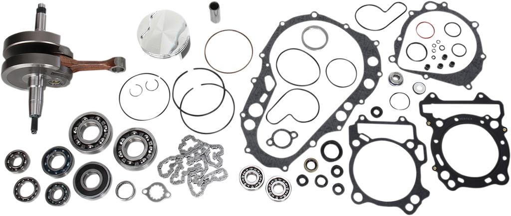Convenient one-stop shop in a box; nearly all components required for a complete and professional rebuild, Vertex piston kit (standard compression piston, rings, pin and clips), Hot Rods heavy-duty crank (stock stroke – includes wrist pin bearing for two strokes), Hot Rods main bearing/seal kit, Hot Rods transmission bearing kit (includes transmission bearings, output shaft collar and sprocket lock washer), Hot Rods counter balancer bearing kit, Hot Rods water pump bearing and seal kit, Vertex complete gaskets kit, including seals and O-ring kit (covers top and bottom)