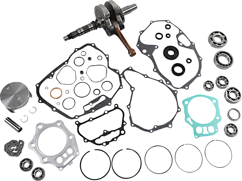 Complete engine rebuild kit, Includes crankshaft, piston kit, complete engine gasket kit with oil seals, main bearings and seals, water pump rebuild kit, transmission bearings, countershaft bushing/seal kit, wrist pin bearing, cam chain and counter balancer bearings when applicable