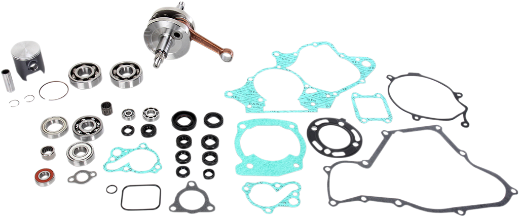 Convenient one-stop shop in a box; nearly all components required for a complete and professional rebuild, Vertex piston kit (standard compression piston, rings, pin and clips), Hot Rods heavy-duty crank (stock stroke – includes wrist pin bearing for two strokes), Hot Rods main bearing/seal kit, Hot Rods transmission bearing kit (includes transmission bearings, output shaft collar and sprocket lock washer), Hot Rods counter balancer bearing kit, Hot Rods water pump bearing and seal kit, Vertex complete gaskets kit, including seals and O-ring kit (covers top and bottom)