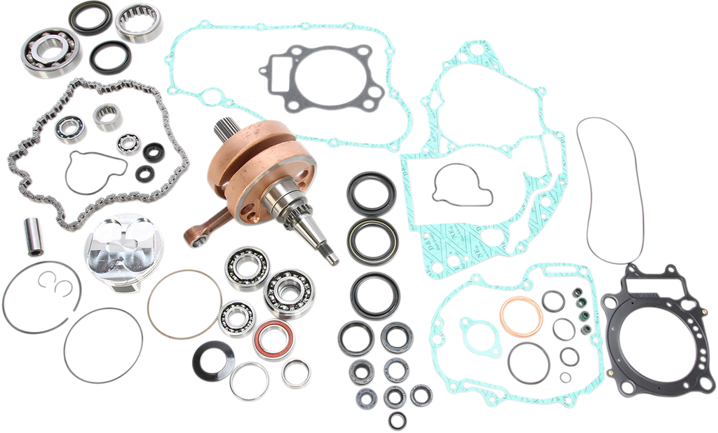 Convenient one-stop shop in a box; nearly all components required for a complete and professional rebuild, Vertex piston kit (standard compression piston, rings, pin and clips), Hot Rods heavy-duty crank (stock stroke – includes wrist pin bearing for two strokes), Hot Rods main bearing/seal kit, Hot Rods transmission bearing kit (includes transmission bearings, output shaft collar and sprocket lock washer), Hot Rods counter balancer bearing kit, Hot Rods water pump bearing and seal kit, Vertex complete gaskets kit, including seals and O-ring kit (covers top and bottom)