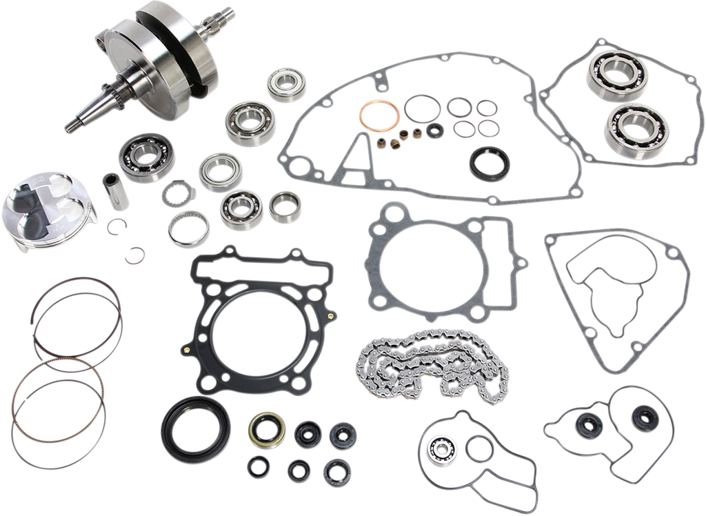 Convenient one-stop shop in a box; nearly all components required for a complete and professional rebuild, Vertex piston kit (standard compression piston, rings, pin and clips), Hot Rods heavy-duty crank (stock stroke – includes wrist pin bearing for two strokes), Hot Rods main bearing/seal kit, Hot Rods transmission bearing kit (includes transmission bearings, output shaft collar and sprocket lock washer), Hot Rods counter balancer bearing kit, Hot Rods water pump bearing and seal kit, Vertex complete gaskets kit, including seals and O-ring kit (covers top and bottom)