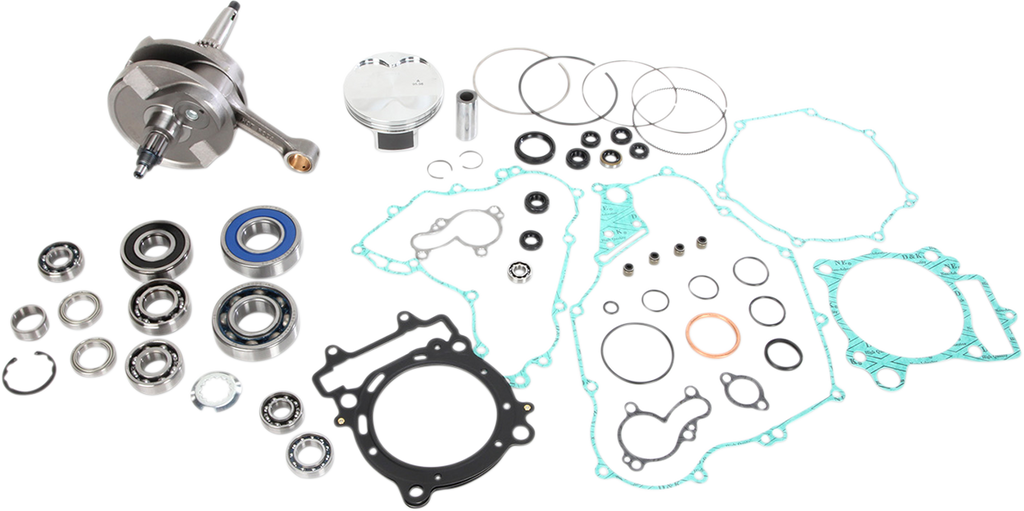 Convenient one-stop shop in a box; nearly all components required for a complete and professional rebuild, Vertex piston kit (standard compression piston, rings, pin and clips), Hot Rods heavy-duty crank (stock stroke – includes wrist pin bearing for two strokes), Hot Rods main bearing/seal kit, Hot Rods transmission bearing kit (includes transmission bearings, output shaft collar and sprocket lock washer), Hot Rods counter balancer bearing kit, Hot Rods water pump bearing and seal kit, Vertex complete gaskets kit, including seals and O-ring kit (covers top and bottom)