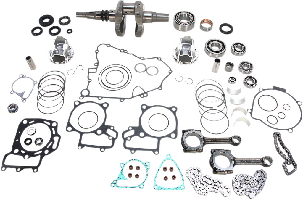 Convenient one-stop shop in a box; nearly all components required for a complete and professional rebuild, Vertex piston kit (standard compression piston, rings, pin and clips), Hot Rods heavy-duty crank (stock stroke – includes wrist pin bearing for two strokes), Hot Rods main bearing/seal kit, Hot Rods transmission bearing kit (includes transmission bearings, output shaft collar and sprocket lock washer), Hot Rods counter balancer bearing kit, Hot Rods water pump bearing and seal kit, Vertex complete gaskets kit, including seals and O-ring kit (covers top and bottom)