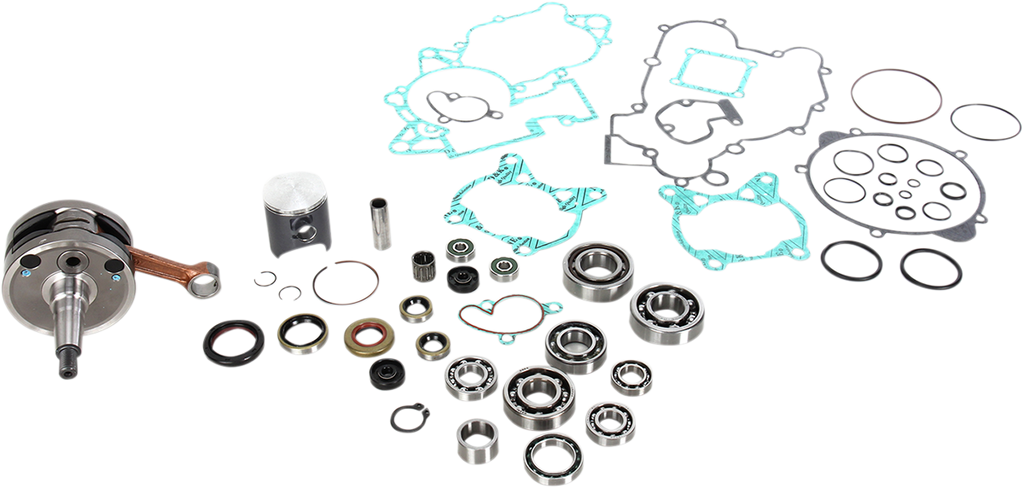 Convenient one-stop shop in a box; nearly all components required for a complete and professional rebuild, Vertex piston kit (standard compression piston, rings, pin and clips), Hot Rods heavy-duty crank (stock stroke – includes wrist pin bearing for two strokes), Hot Rods main bearing/seal kit, Hot Rods transmission bearing kit (includes transmission bearings, output shaft collar and sprocket lock washer), Hot Rods counter balancer bearing kit, Hot Rods water pump bearing and seal kit, Vertex complete gaskets kit, including seals and O-ring kit (covers top and bottom)