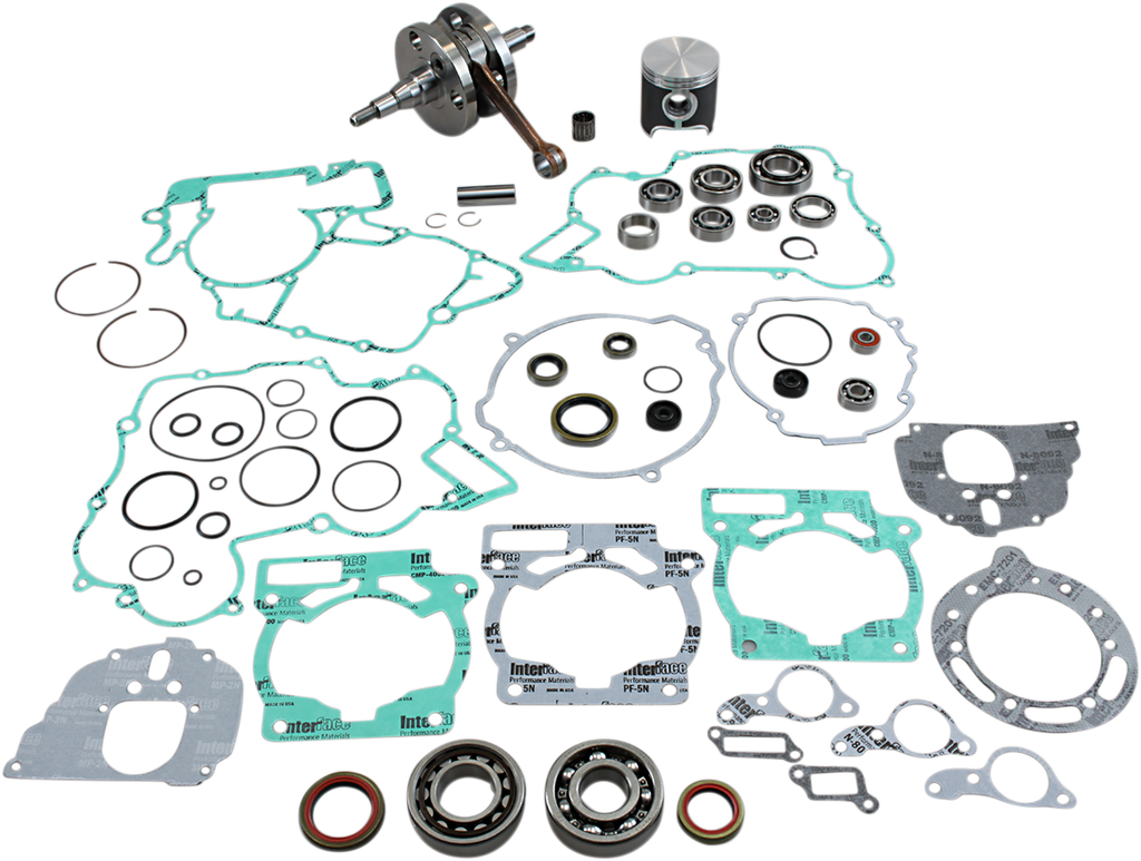 Convenient one-stop shop in a box; nearly all components required for a complete and professional rebuild, Vertex piston kit (standard compression piston, rings, pin and clips), Hot Rods heavy-duty crank (stock stroke – includes wrist pin bearing for two strokes), Hot Rods main bearing/seal kit, Hot Rods transmission bearing kit (includes transmission bearings, output shaft collar and sprocket lock washer), Hot Rods counter balancer bearing kit, Hot Rods water pump bearing and seal kit, Vertex complete gaskets kit, including seals and O-ring kit (covers top and bottom)