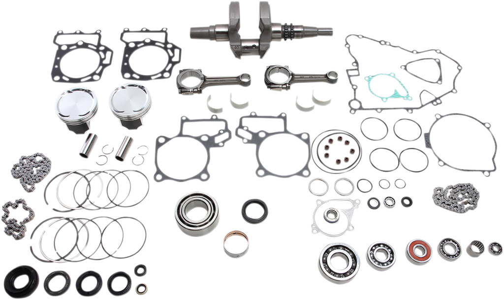 Convenient one-stop shop in a box; nearly all components required for a complete and professional rebuild, Vertex piston kit (standard compression piston, rings, pin and clips), Hot Rods heavy-duty crank (stock stroke – includes wrist pin bearing for two strokes), Hot Rods main bearing/seal kit, Hot Rods transmission bearing kit (includes transmission bearings, output shaft collar and sprocket lock washer), Hot Rods counter balancer bearing kit, Hot Rods water pump bearing and seal kit, Vertex complete gaskets kit, including seals and O-ring kit (covers top and bottom)