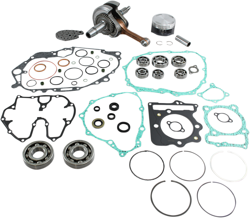 Convenient one-stop shop in a box; nearly all components required for a complete and professional rebuild, Vertex piston kit (standard compression piston, rings, pin and clips), Hot Rods heavy-duty crank (stock stroke – includes wrist pin bearing for two strokes), Hot Rods main bearing/seal kit, Hot Rods transmission bearing kit (includes transmission bearings, output shaft collar and sprocket lock washer), Hot Rods counter balancer bearing kit, Hot Rods water pump bearing and seal kit, Vertex complete gaskets kit, including seals and O-ring kit (covers top and bottom)