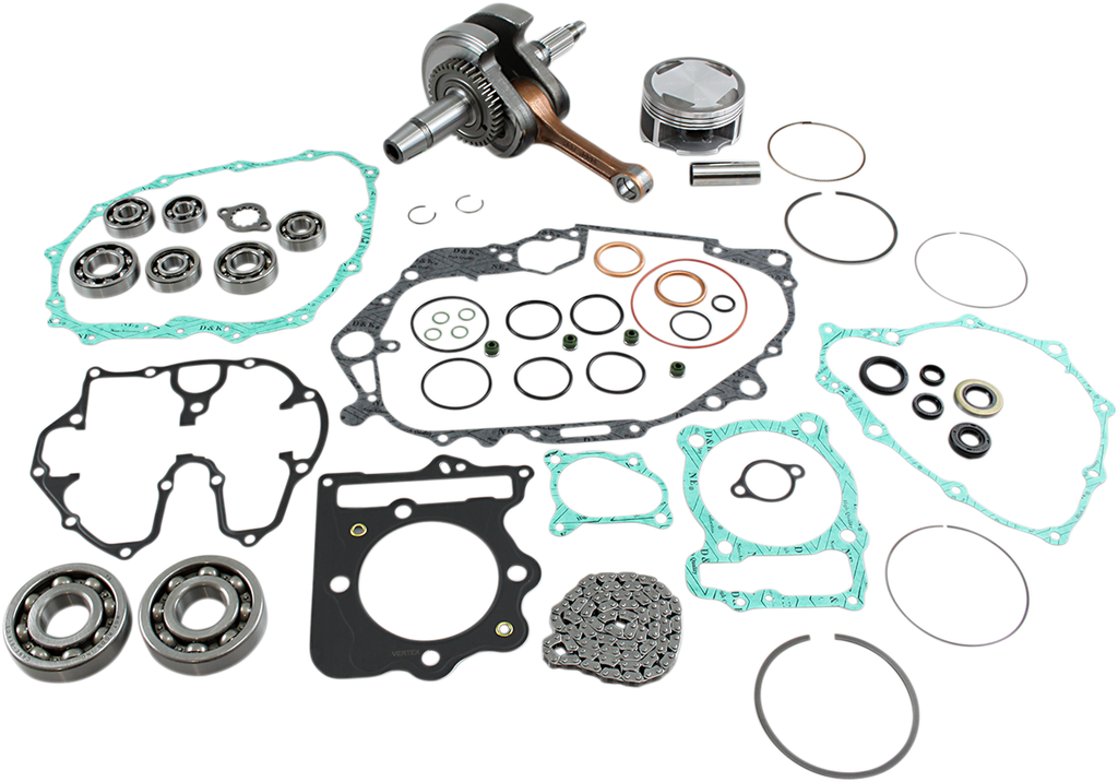 Convenient one-stop shop in a box; nearly all components required for a complete and professional rebuild, Vertex piston kit (standard compression piston, rings, pin and clips), Hot Rods heavy-duty crank (stock stroke – includes wrist pin bearing for two strokes), Hot Rods main bearing/seal kit, Hot Rods transmission bearing kit (includes transmission bearings, output shaft collar and sprocket lock washer), Hot Rods counter balancer bearing kit, Hot Rods water pump bearing and seal kit, Vertex complete gaskets kit, including seals and O-ring kit (covers top and bottom)