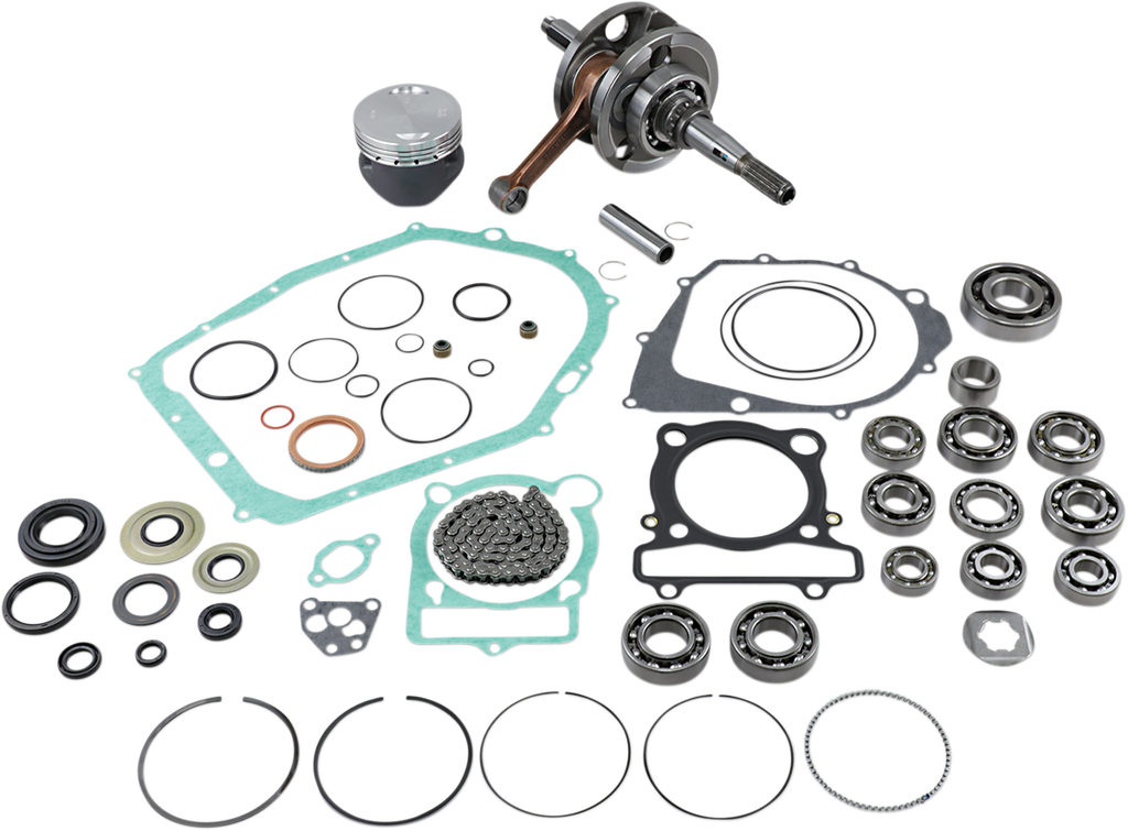 Convenient one-stop shop in a box; nearly all components required for a complete and professional rebuild, Vertex piston kit (standard compression piston, rings, pin and clips), Hot Rods heavy-duty crank (stock stroke – includes wrist pin bearing for two strokes), Hot Rods main bearing/seal kit, Hot Rods transmission bearing kit (includes transmission bearings, output shaft collar and sprocket lock washer), Hot Rods counter balancer bearing kit, Hot Rods water pump bearing and seal kit, Vertex complete gaskets kit, including seals and O-ring kit (covers top and bottom)