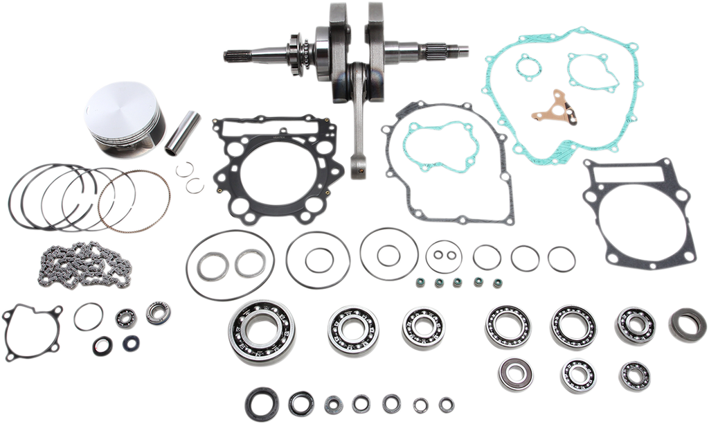 Convenient one-stop shop in a box; nearly all components required for a complete and professional rebuild, Vertex piston kit (standard compression piston, rings, pin and clips), Hot Rods heavy-duty crank (stock stroke – includes wrist pin bearing for two strokes), Hot Rods main bearing/seal kit, Hot Rods transmission bearing kit (includes transmission bearings, output shaft collar and sprocket lock washer), Hot Rods counter balancer bearing kit, Hot Rods water pump bearing and seal kit, Vertex complete gaskets kit, including seals and O-ring kit (covers top and bottom)