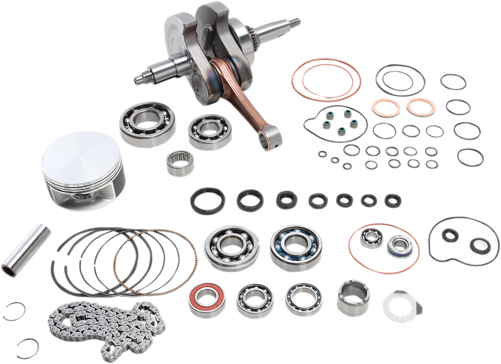 Convenient one-stop shop in a box; nearly all components required for a complete and professional rebuild, Vertex piston kit (standard compression piston, rings, pin and clips), Hot Rods heavy-duty crank (stock stroke – includes wrist pin bearing for two strokes), Hot Rods main bearing/seal kit, Hot Rods transmission bearing kit (includes transmission bearings, output shaft collar and sprocket lock washer), Hot Rods counter balancer bearing kit, Hot Rods water pump bearing and seal kit, Vertex complete gaskets kit, including seals and O-ring kit (covers top and bottom)