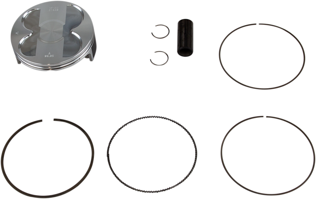 All pistons are heat treated with a T-5 hardening and tempering cycle, All piston skirts are coated with a high-tech Molybdenum Disulphite coating for faster break-in time and increased piston life, Cast piston kits are gravity cast aluminum alloy (not forged) with 18% silicone content, which produces an extremely light but very strong piston, Forged pistons are forged from 2618 aluminum for superior strength and durability, Forged High Compression pistons improve power and torque across entire rpm range, Big Bore pistons increase engine’s displacement, torque, and peak horsepower, Forged Replica pistons are forged OE replacements, Replica pistons and all rings are OEM replacements, Kit includes piston, rings, wrist pin and circlips, Replacement two-stroke piston rings sold individually; four-stroke piston rings sold as a set as needed