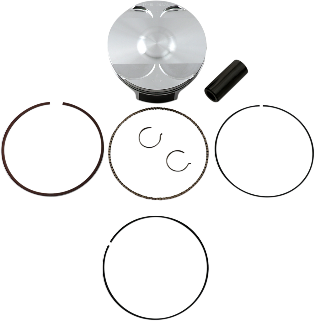All pistons are heat treated with a T-5 hardening and tempering cycle, All piston skirts are coated with a high-tech Molybdenum Disulphite coating for faster break-in time and increased piston life, Cast piston kits are gravity cast aluminum alloy (not forged) with 18% silicone content, which produces an extremely light but very strong piston, Forged pistons are forged from 2618 aluminum for superior strength and durability, Forged High Compression pistons improve power and torque across entire rpm range, Big Bore pistons increase engine’s displacement, torque, and peak horsepower, Forged Replica pistons are forged OE replacements, Replica pistons and all rings are OEM replacements, Kit includes piston, rings, wrist pin and circlips, Replacement two-stroke piston rings sold individually; four-stroke piston rings sold as a set as needed