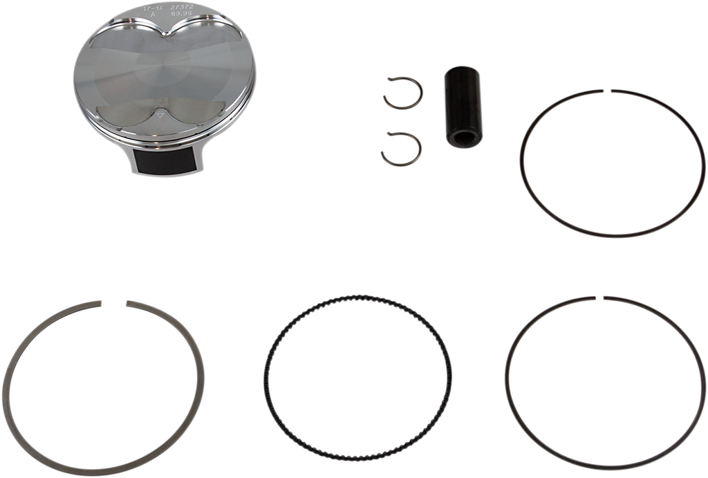 All pistons are heat treated with a T-5 hardening and tempering cycle, All piston skirts are coated with a high-tech Molybdenum Disulphite coating for faster break-in time and increased piston life, Cast piston kits are gravity cast aluminum alloy (not forged) with 18% silicone content, which produces an extremely light but very strong piston, Forged pistons are forged from 2618 aluminum for superior strength and durability, Forged High Compression pistons improve power and torque across entire rpm range, Big Bore pistons increase engine’s displacement, torque, and peak horsepower, Forged Replica pistons are forged OE replacements, Replica pistons and all rings are OEM replacements, Kit includes piston, rings, wrist pin and circlips, Replacement two-stroke piston rings sold individually; four-stroke piston rings sold as a set as needed