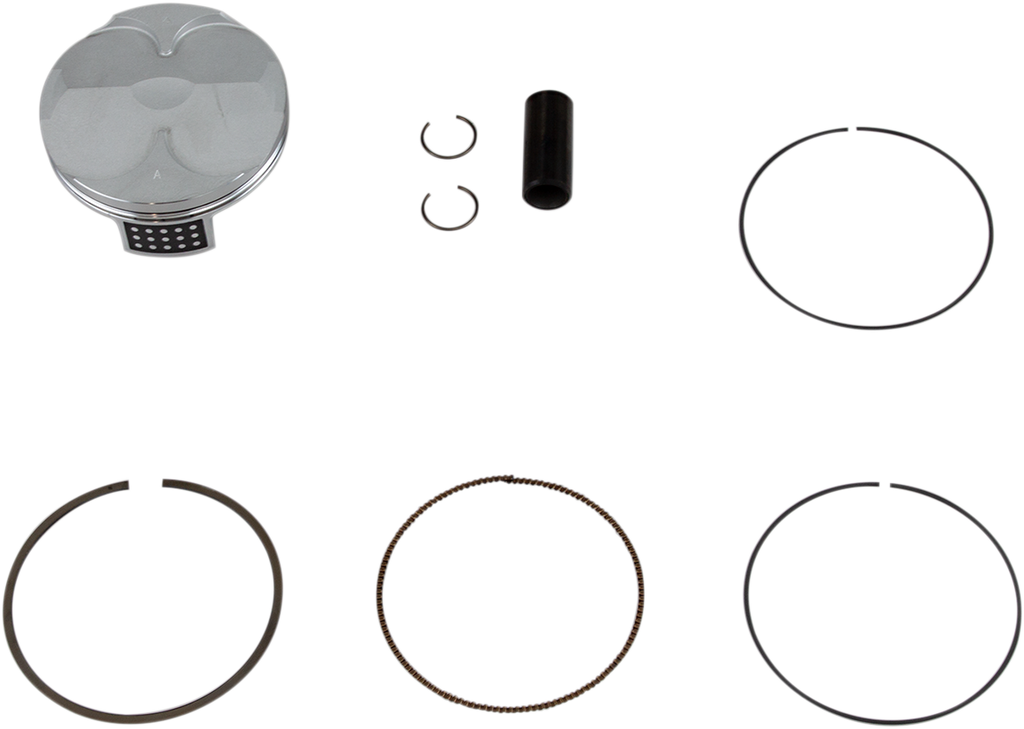All pistons are heat treated with a T-5 hardening and tempering cycle, All piston skirts are coated with a high-tech Molybdenum Disulphite coating for faster break-in time and increased piston life, Cast piston kits are gravity cast aluminum alloy (not forged) with 18% silicone content, which produces an extremely light but very strong piston, Forged pistons are forged from 2618 aluminum for superior strength and durability, Forged High Compression pistons improve power and torque across entire rpm range, Big Bore pistons increase engine’s displacement, torque, and peak horsepower, Forged Replica pistons are forged OE replacements, Replica pistons and all rings are OEM replacements, Kit includes piston, rings, wrist pin and circlips, Replacement two-stroke piston rings sold individually; four-stroke piston rings sold as a set as needed